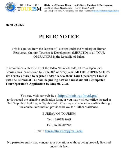 In accordance with Title 11 of the Palau National Code, all Tour Operator’s licenses must be renewed by June 30th of every year. All TOUR OPERATORS are hereby advised to register and/or renew their Tour Operator’s License with the Bureau of Tourism beginning now and must submit a completed Tour Operator’s Application by May 01, 2026.