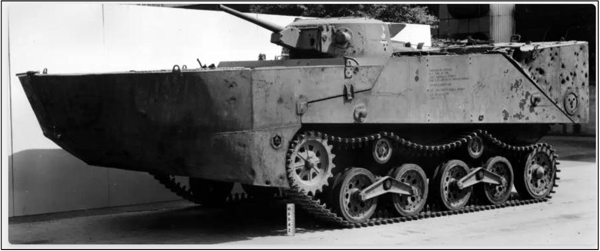 The vehicle displayed here retains its stern pontoon, while the bow pontoon is missing. The pontoons were often removed or lost after the war, and surviving examples are rarely complete.